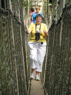 We finally made it to the top where we climbed a wooden ladder to a tree house large enough to hold about 10 people. This is where the excitement began! Stretched between 2 trees and about 40 meters above the rainforest floor was a swinging rope bridge. It was made of metal ladders covered with wooden planks no wider than 12 inches and woven rope sides. Not for the weak at heart! I was so excited to walk across this bridge! It was amazing and breathtaking to be standing that high above the rainforest! The only sounds were the birds in the trees. On the second bridge I stopped in the middle to photograph the most beautiful, orange butterfly. There were white butterflies everywhere but none stayed still long enough to photograph. On the platforms around the trees, between the bridges, you could see for what seemed like forever. By the time I reached the last bridge I was a pro and took the team’s challenge to walk across without holding on. I’m proud to say that we all were able to do it!!!