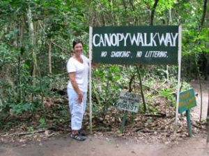 Our tour guide was Fred. He led our group, Debi, Beth, Lisa, Tana, Moses, Ali, myself and 2 other Americans up the pathway to the canopy. The path was very rocky and sandy with many tree roots throughout. Halfway up there was a little stand where you could buy a coconut and drink the milk while you took a little rest. We toughed it out and kept walking. The walk was so quiet and peaceful. The only sounds were those of the birds chirping as we climbed the 550 meters to the top. It doesn’t sound hard but when it is a steep, rocky slope it is!