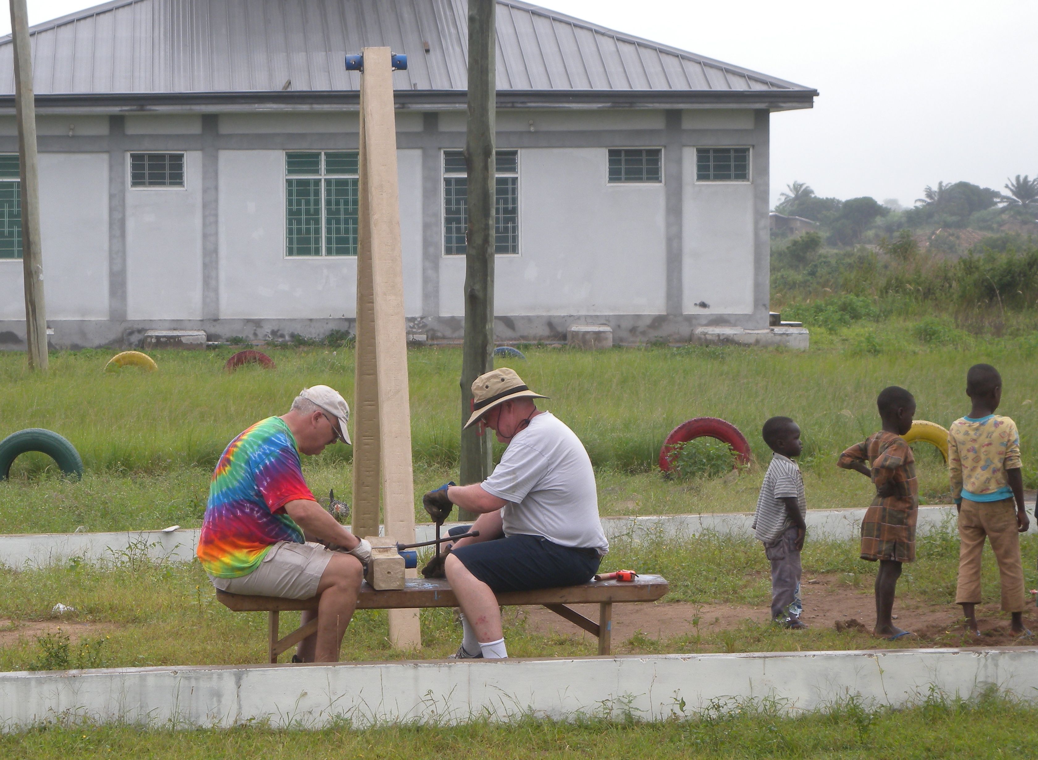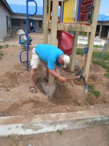 West Africa to tell you a little bit of my experiences working on the two member construction team of Bruce Neumann and myself. Our original goal was to take down old swing set and rebuild it with new materials we had sent over in a container months ago. Red tape and new governmental regulations has tied up the container for another month at the port of Tema.