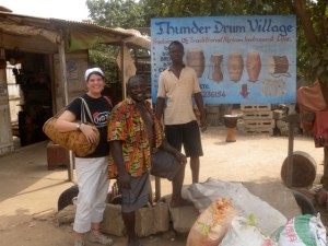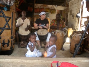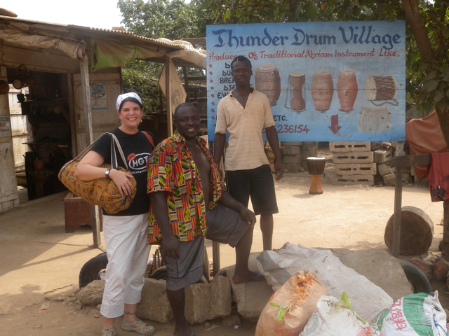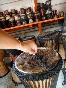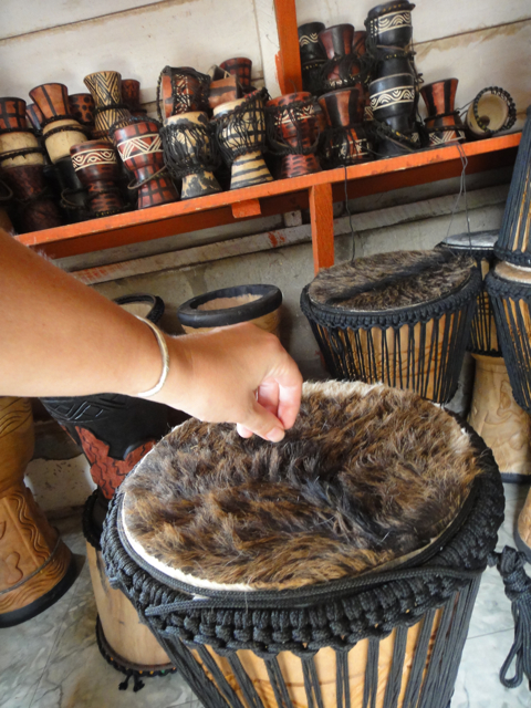 Ok, nerd alert: I’m a traveling music teacher. I already crashed a choir rehearsal this week, so I was looking for a real African drum, made by a real African. Mom took me to a shop in the back called “Thunder Drums”. This was the real deal. The guy made the drums right there in the shop, the skins were all out hanging to be tanned and dried, and was very personable and knowledgeable. We talked wood, rope, heads, and finish. He had some newly created Djembes with the fur still on the heads. I negotiated a price, which I thought was more than reasonable – especially since I know what these go for at your local music dealer – and asked him if I could have a photo with him. He called his brother over, and the next thing I know I’m in the middle of a drum circle. OH MY GOD, an African drum circle….IN AFRICA. He shows me a basic rhythmic ostinato and then he improvises over top, all while Mom is taking video. Seriously, I would have paid double just for the experience. After we were done, he spent nearly 30 minutes cleaning up the drum, shaving any last bits of hair off the head, and applying another coat of sealer for the travel. When I finally made it out of the market,
