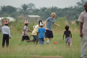 The whole reason I’m here, the reading camp, is the main topic of this article. The expression of absolute joy on the children’s faces when we arrive will stick with me the rest of my life. The second you get off the bus, you are bombarded with wave after wave of children running over to you, holding your hands, your arms, your legs, climbing on you. They argue in rapid-fire Ga and Twei over the limited space left on me to hold on to, yelling ball, football, wanting to play soccer before classes begin.