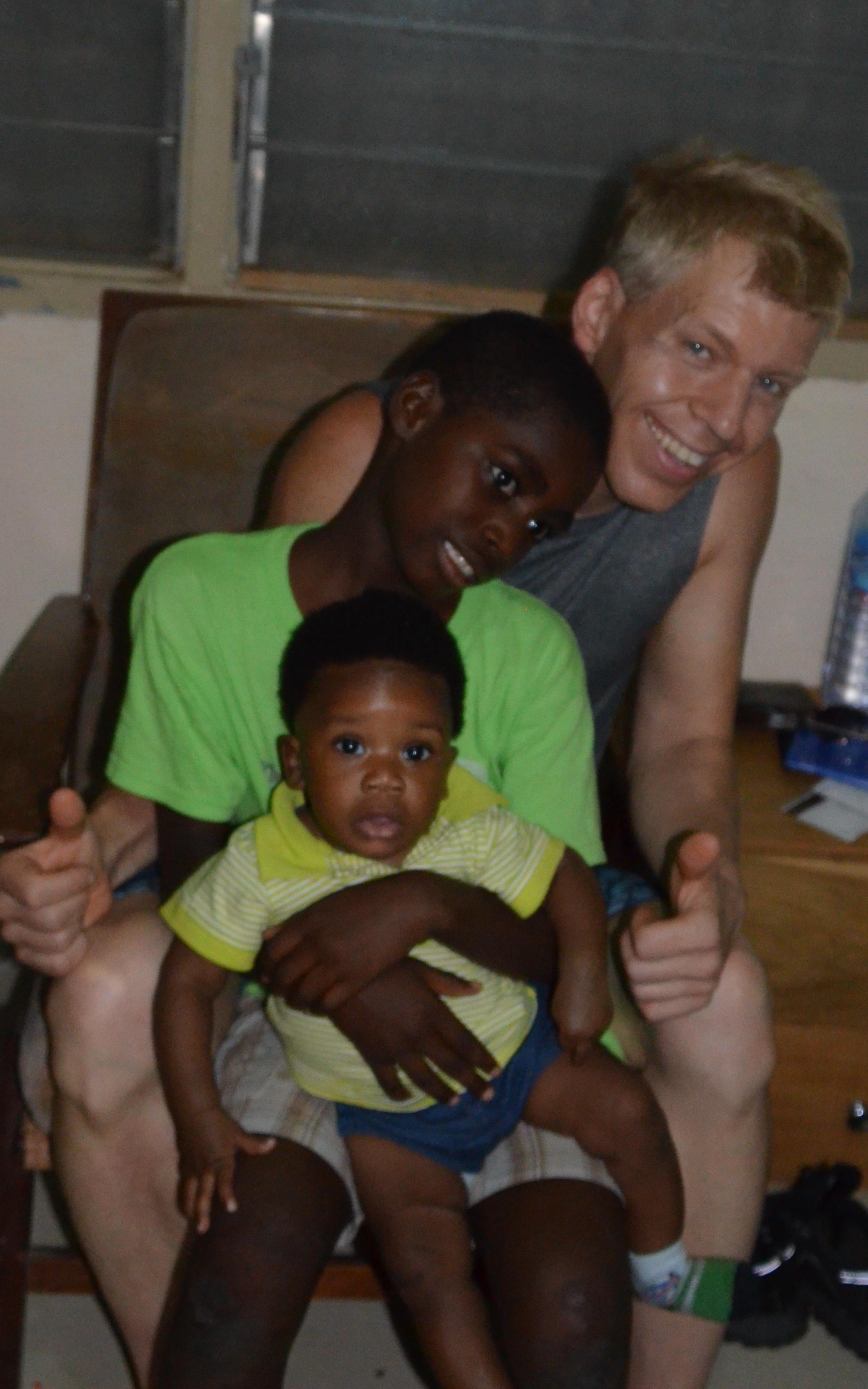 The word that kept coming to my mind all day today was “resolve.” They are very good at going with the flow here! Two schools we visited had classrooms that are outside. What I mean is they had open walls. So you could be teaching a lesson and all of the sudden hear a goat! At another, the children were piled onto the veranda. Desks are different over here. Three children share a desk. And I didn’t see them fighting over space for their coloring books either. They helped each other see whatever page Debi was teaching from. There were always children from other classrooms lurking about as well. I mean how often does a blond haired blue-eyed American with Norwegian heritage visit their school flexing his muscles and playing guitar!