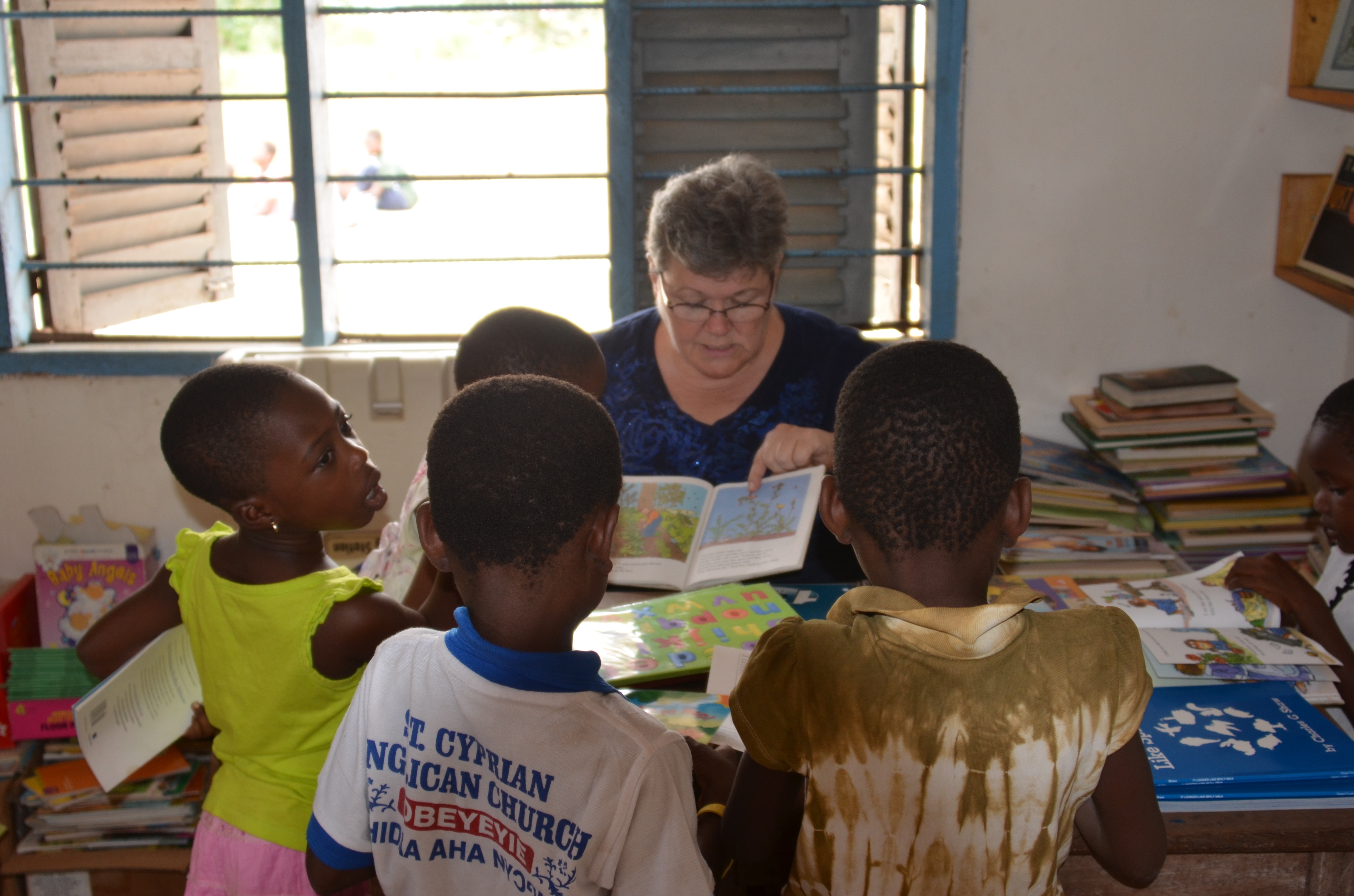 We were called back to work. One group of people assembled supply bags for each child so they would have everything they needed for the week. I headed to the library to level the books that were there and all of the books that we brought with us so that all of the books that were out were camp level. When I emerged from the library people were scattered all over the place. Bruce & Scott were working on the playground, Maggie got a soccer game going, Raegan, Elizabeth, and Adriana were on the playground and Debi & Kimberly were singing and playing with children on the porch and there were children everywhere. If there was any doubt why we were all here in Ghana, here was the reason: all of those beautiful, hopeful faces.