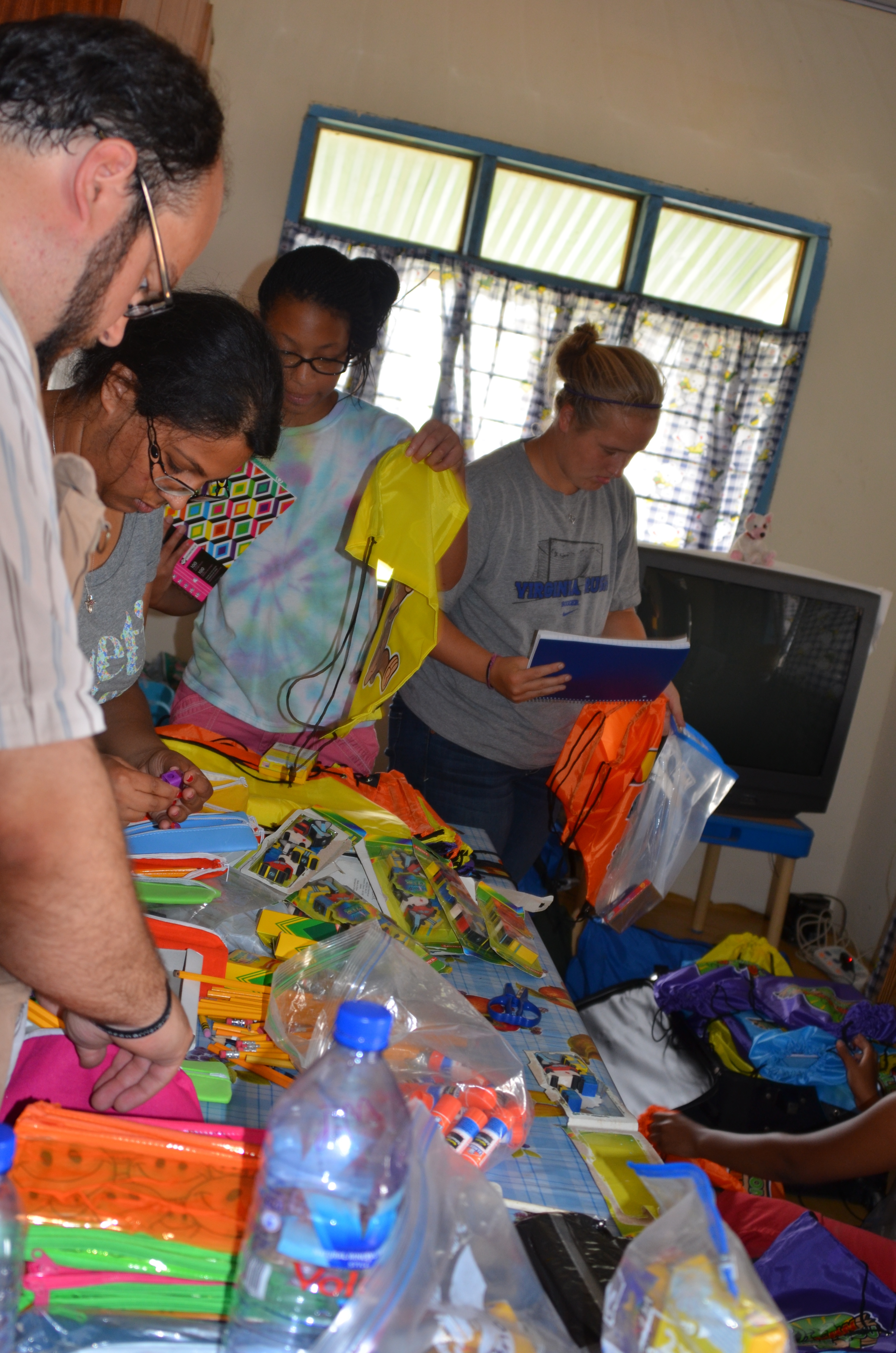 while Accra bustled around us. The bus came to pick us up and we finally headed to the school. The bus was packed to the roof with suitcases and supplies for camp. It took us just over 1 ½ hours to get to the school. Most of the roads were now paved, although we heard that was not true when the school was first built. We turned on the road to the school and the first thing we saw was the playground. As we pulled into the yard the director, Anastasia, and all of her teachers poured out of the doors and ran to the bus to greet us. Each person was hugged and greeted as they got off the bus, what a wonderful welcome! The first order of business was to empty the bus, unpack all of the supplies and then start sorting everything.