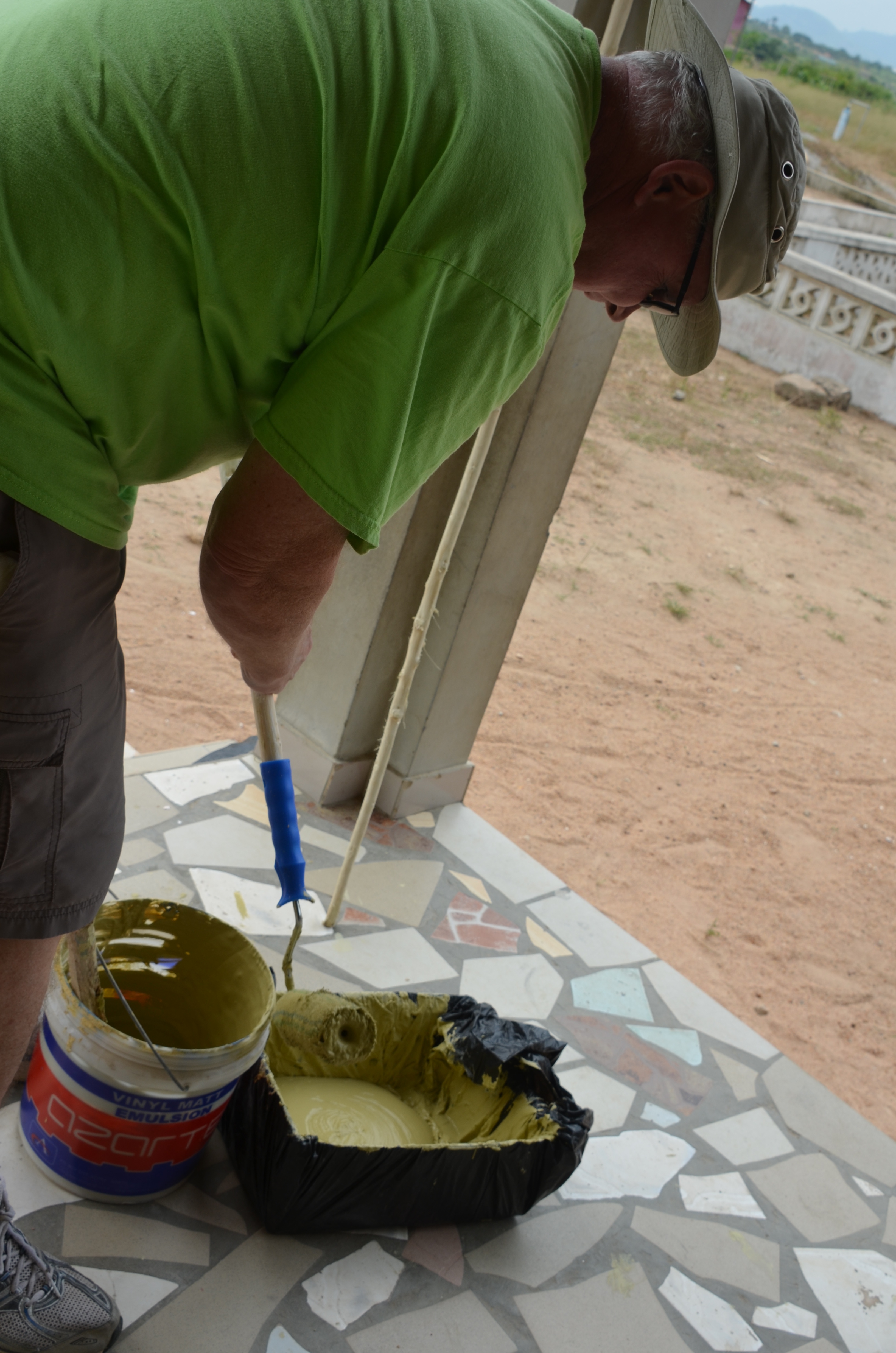 Day 2 Challenge: Buying paint and painting supplies. There are paint stores in a not too far village. Paint, check, paint brushes, check, rollers, check, roller pans—ahh, not in Ghana. Solution: A cardboard box with a plastic bag. We are having our friend, Carpe—the carpenter, make us two roller pans out of wood. Another carpenter cut down 2 pieces of bamboo to make us extension poles.