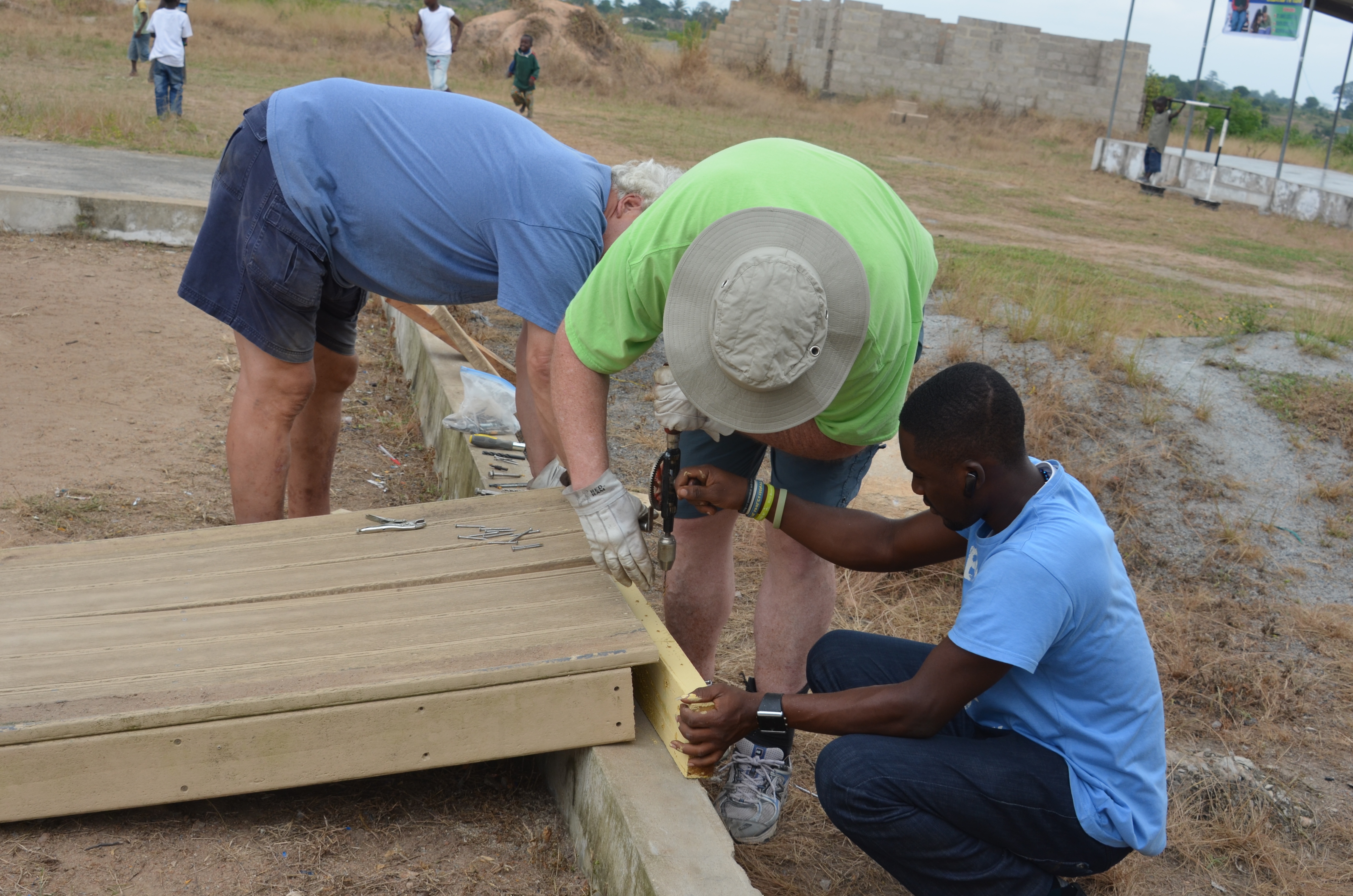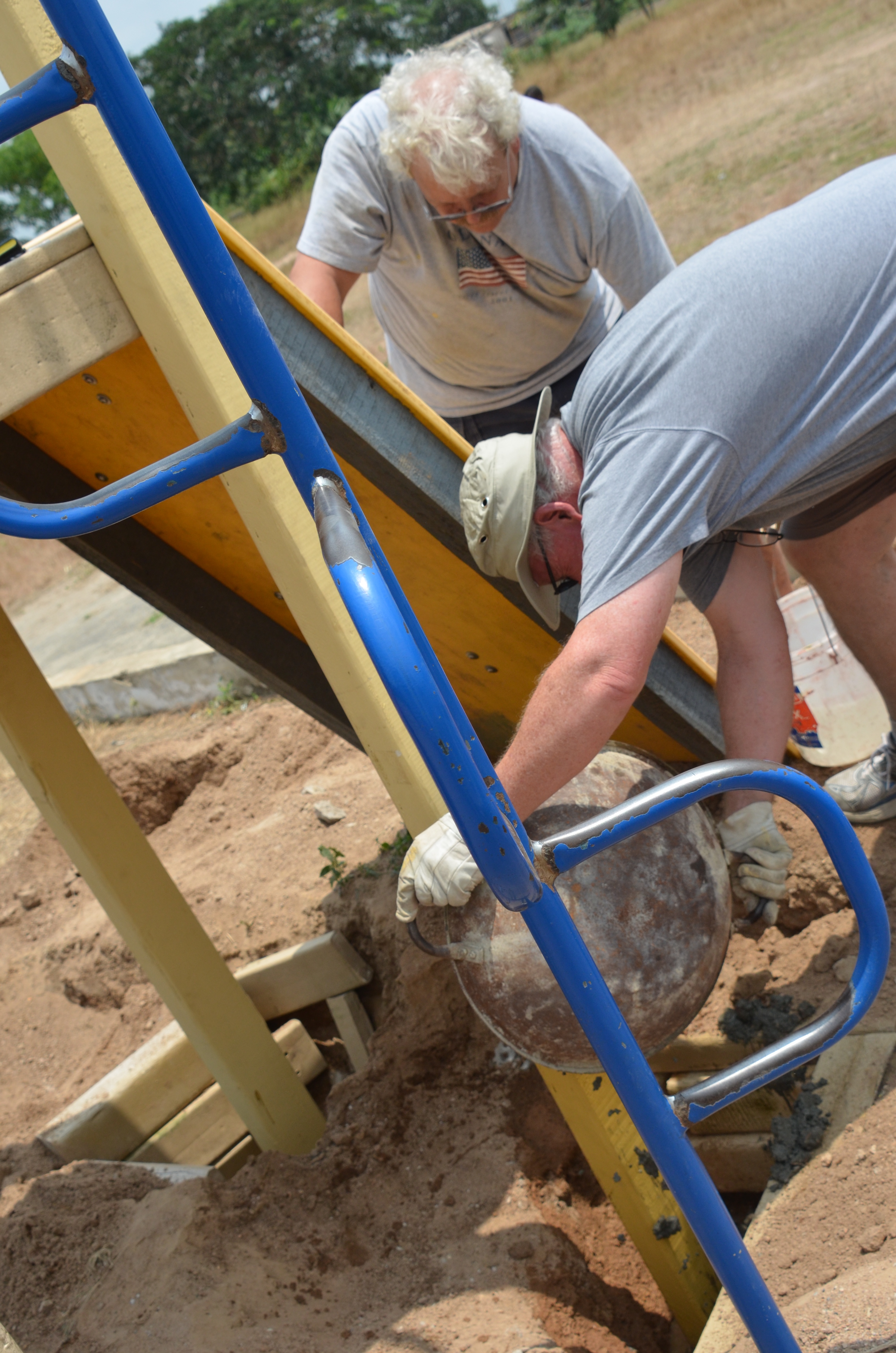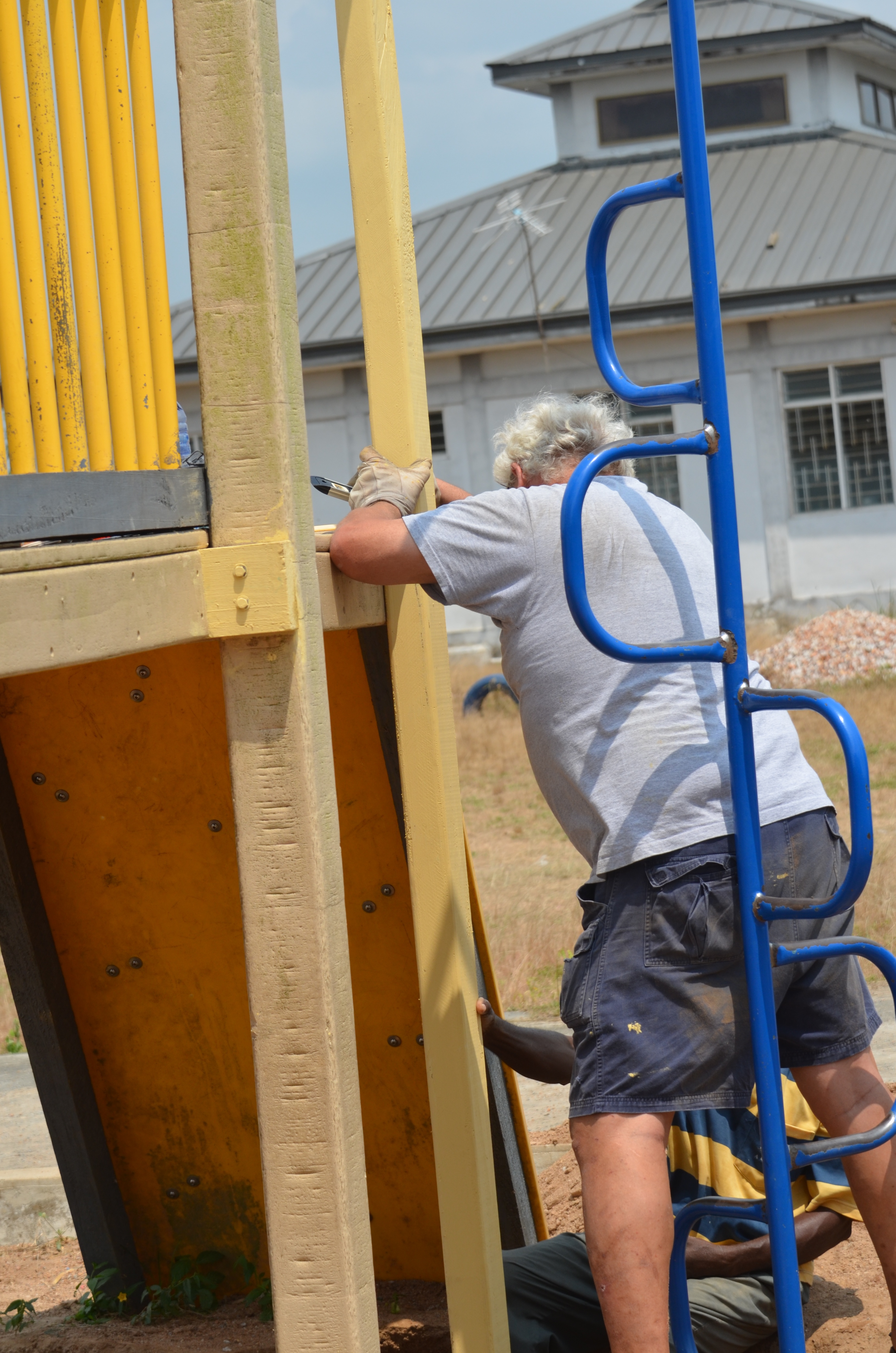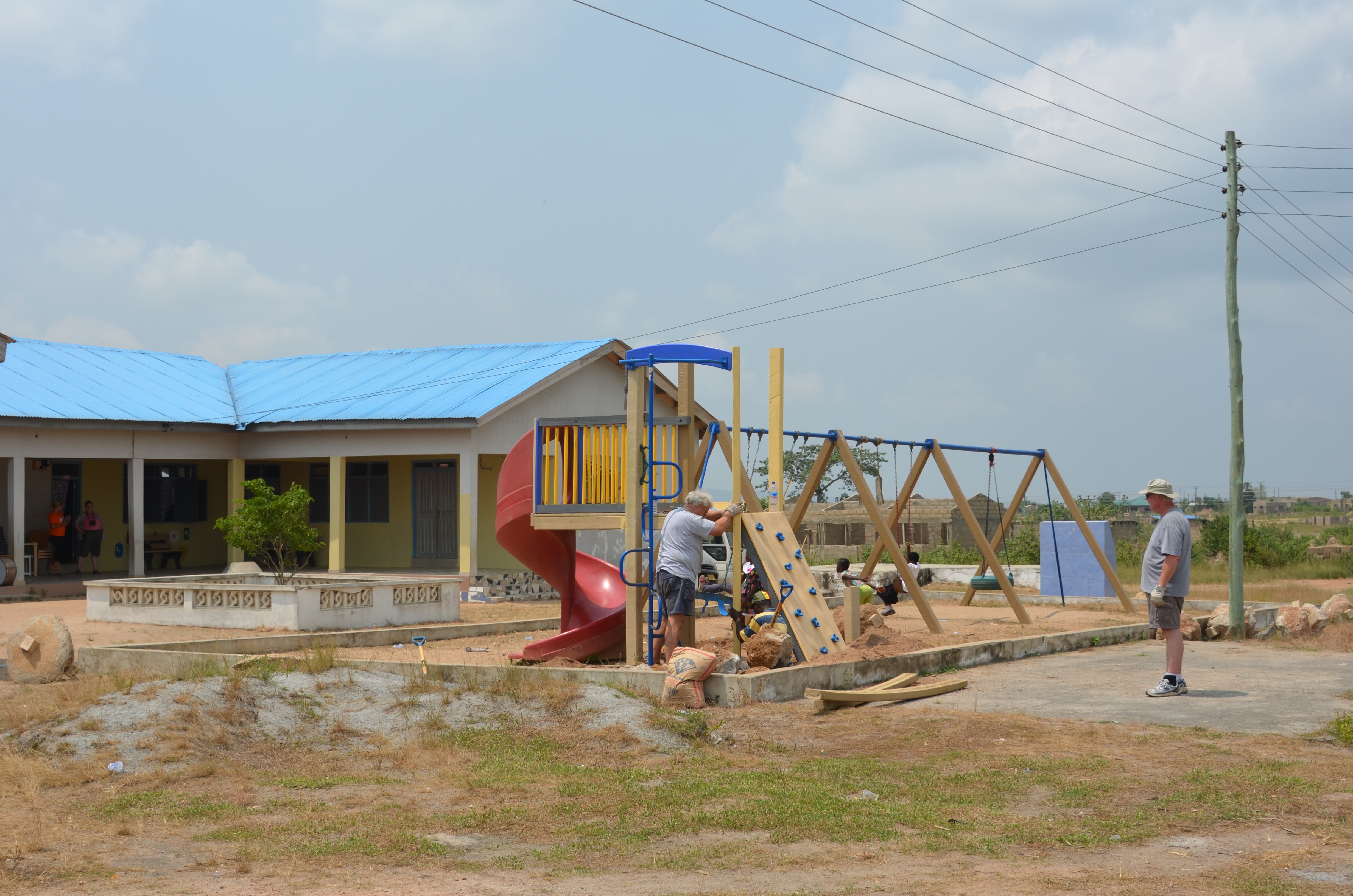 I am on a mission trip to Ghana with Ghanaian Mothers’ Hope and my job is to replace dangerously cracked plastic beams of a playground set. My teammate, Bruce Neumann and I are using a heavy, dense wood for the replacement. We are also painting St. Paul’s preschool in Akramaman. Bruce painted it in 2007 but the wear and tear along with the African sun has taken it’s toll. Day 1 Challenge: All screws on the jungle gym require a square drive crew driver. No square screw driver available. No Ace Hardware, no Walmart! Solution: make your own square driver by filing a screw driver to fit the hole.