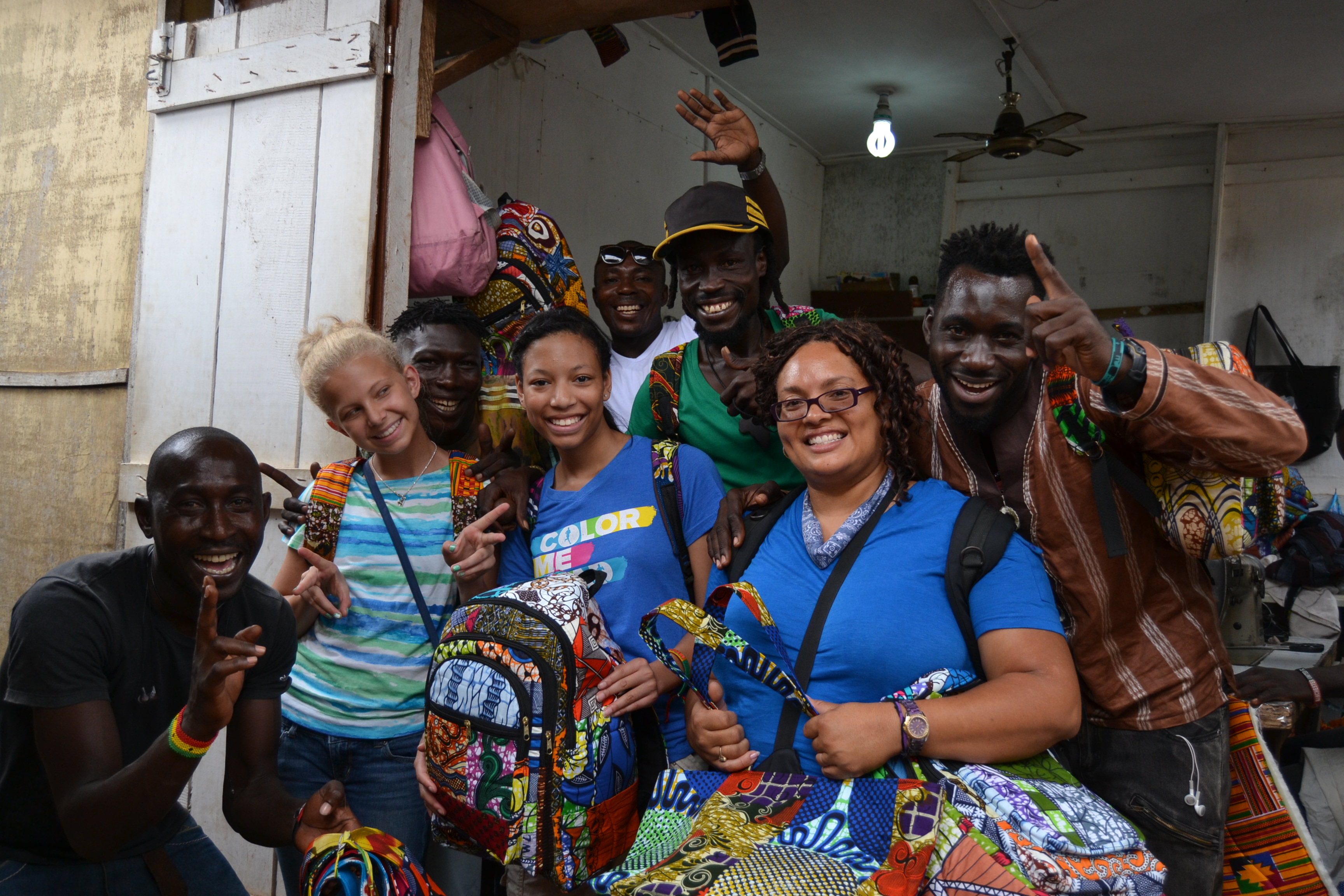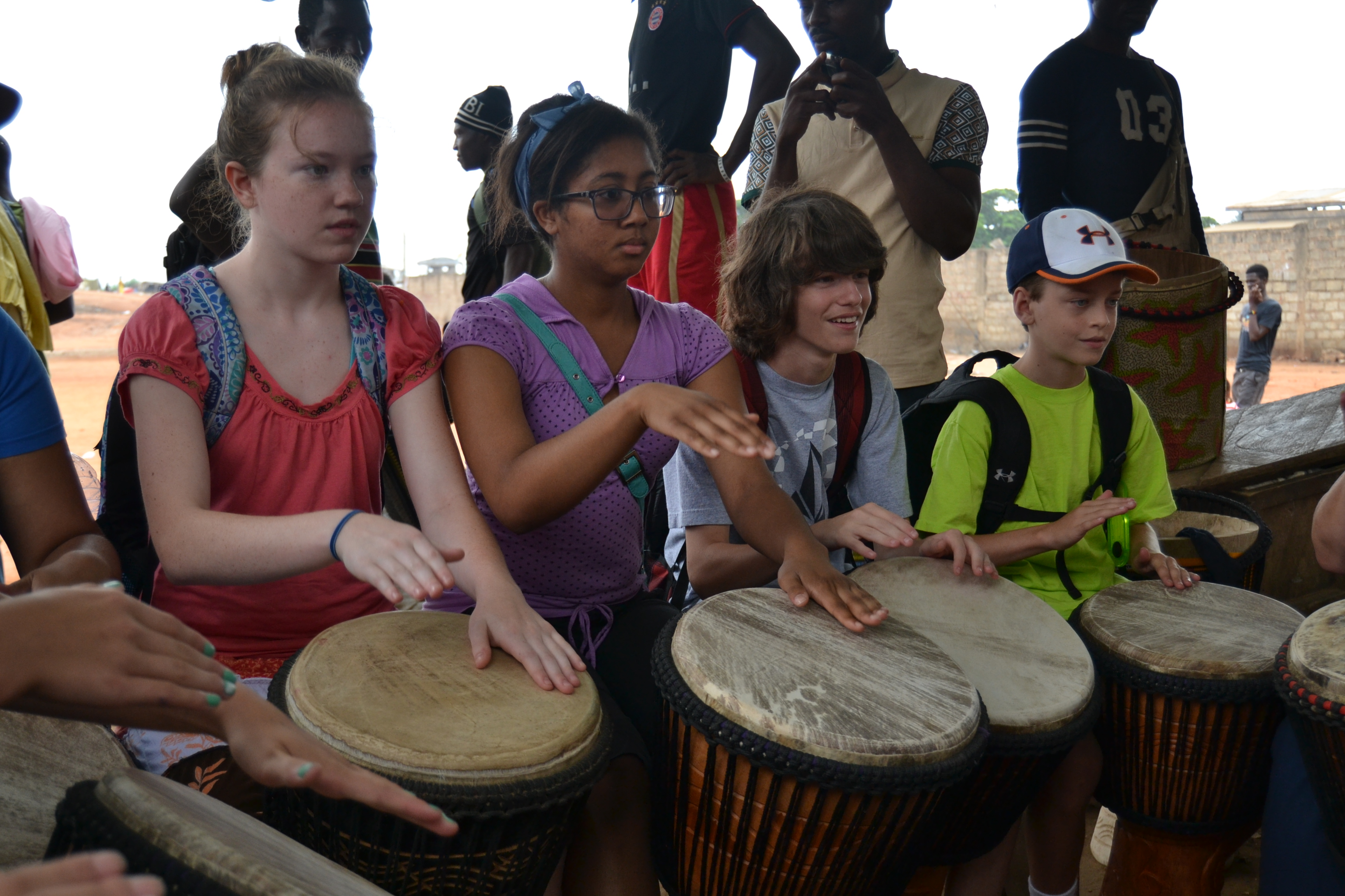 Today, we really got a taste of Ghana when we traveled to the Cultural Market in Accra. As soon as the van pulled into the parking lot, the vendors were right there waiting for us to come out, each of them holding some of their handmade goods. Debi and Mercia arranged for us to be greeted by Joshua, who brought us back to his drum shop. We sat down for a spectacular drum performance, and afterwards, the men taught us some drumming rhythms.
