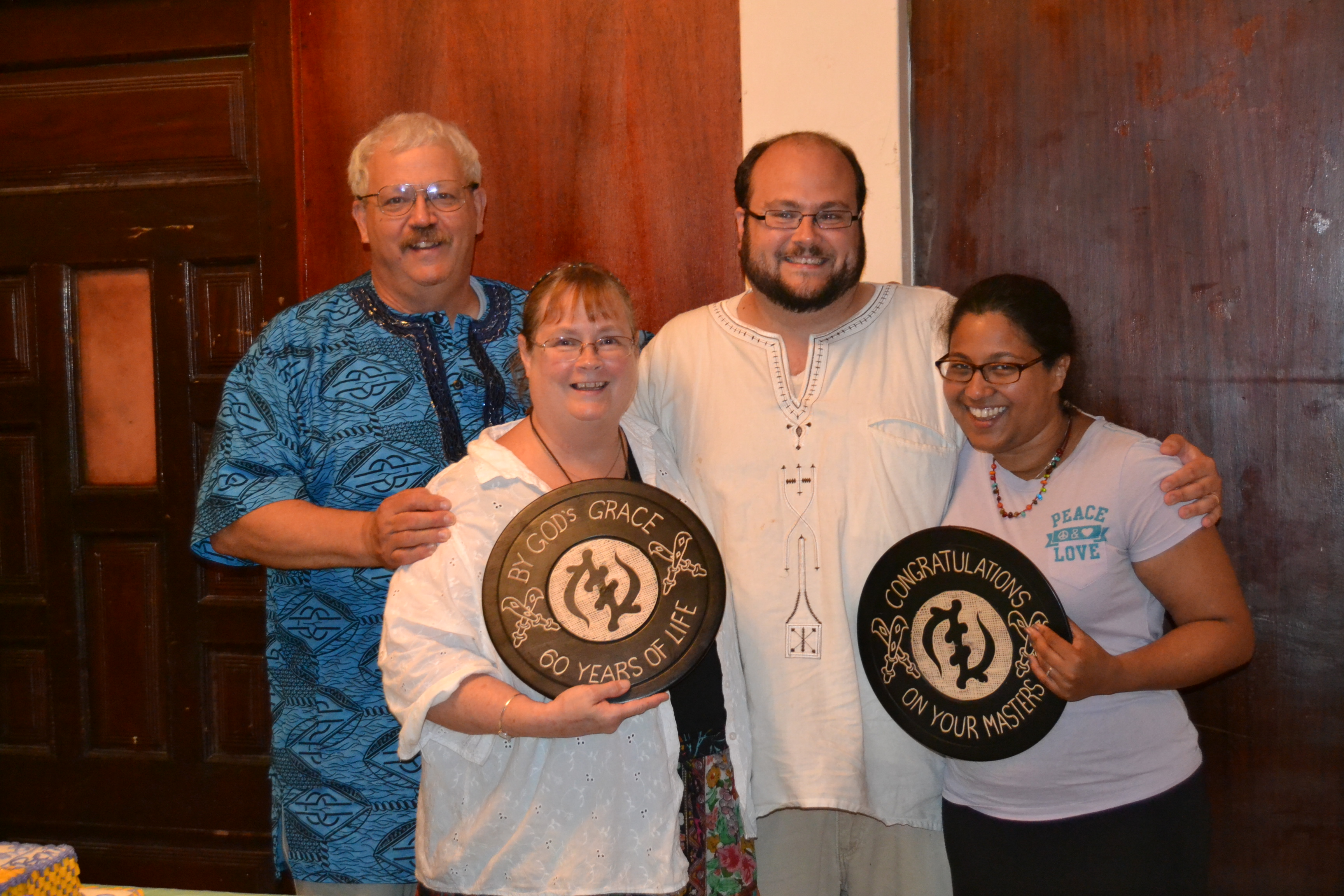 After dinner, we brought out the cake. I rose from my seat to get something out of my bag, but before I could sit down. Debi began talking to everyone about me. I just recently completed my master’s course work and was supposed to walk this summer. However, I choose Ghana over graduation. I could always walk the following semester, but our trip to Ghana only happens once a year. I couldn’t help but smile; it was truly touching to know that all these familiar faces along with strangers came to celebrate my accomplishment. Since I had not received my formal diploma I was handed a wooden plaque that my husband designed along with Debi’s help. After the heartfelt speeches made by my husband and Debi; we moved on to recognize the true superstar of the night, Becki. It was Becki’s birthday and we presented her with a wooden carved plaque along with a loving speech about how wonderful she is and how blessed we are to have her in our lives. As we feasted and dined together, God really shone his love on us. It was a beautiful and perfect evening.